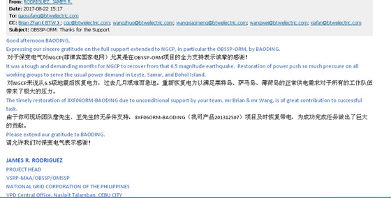 2017年8月22日,保定天威保变电气股份有限公司收到来自菲律宾国家电网技术部项目经理james r.podriguez的感谢信,对保变电气在菲律宾经历6.5级地震后及时恢复201312s07变压器电力供应的无条件全力支持,表示由衷的感谢!